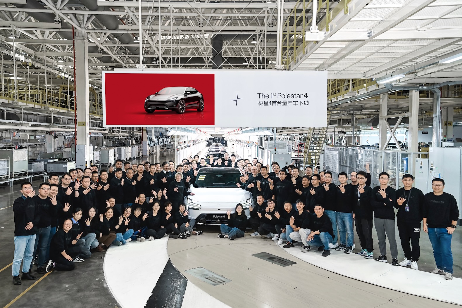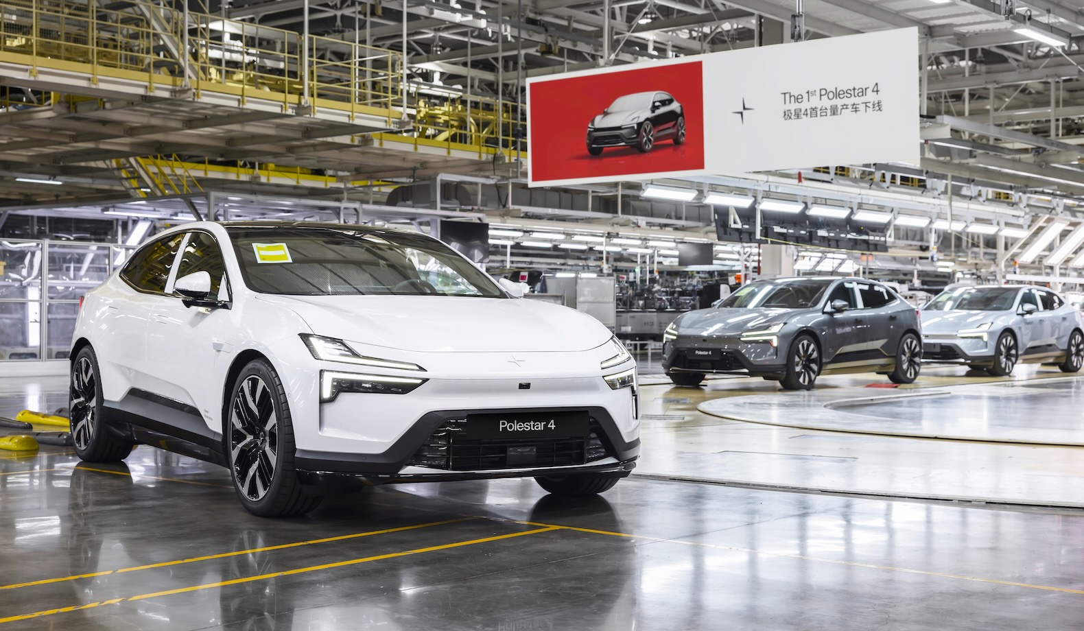 The first Polestar 4 to roll off the assembly line is finished in Snow with the signature Swedish gold details of the Performance Pack. It is the first Polestar to be manufactured at the Hangzhou Bay factory operated by Geely Holding.