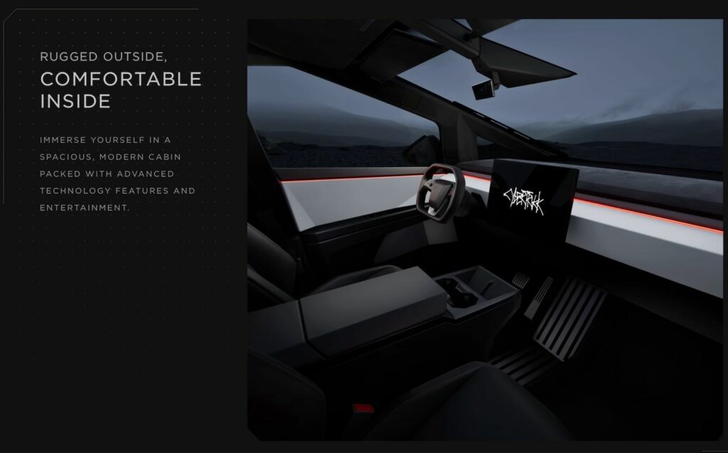 All Tesla Cybertrucks will feature a 4×6-food bed, an 18.5-inch touchscreen display, a 9.4-inch rear touchscreen, four-corner adaptive suspension, steer-by-wire, and four-wheel steering. Other announced Tesla Cybertruck features include a power-opening frunk, a bed made of sheet-molded composite, and “rock-proof” glass.