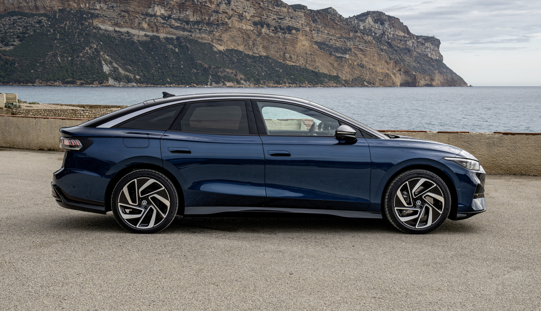 The ID.7 is solidly in the midsize class. It measures 60.5 inches tall, 73.3 inches wide and 195.3 inches long riding on a 117 in wheelbase, although Its design makes it appear even longer. And it allows for 18.8 cubic feet of cargo space, expanding to 56 cubic feet with the rear seats folded.