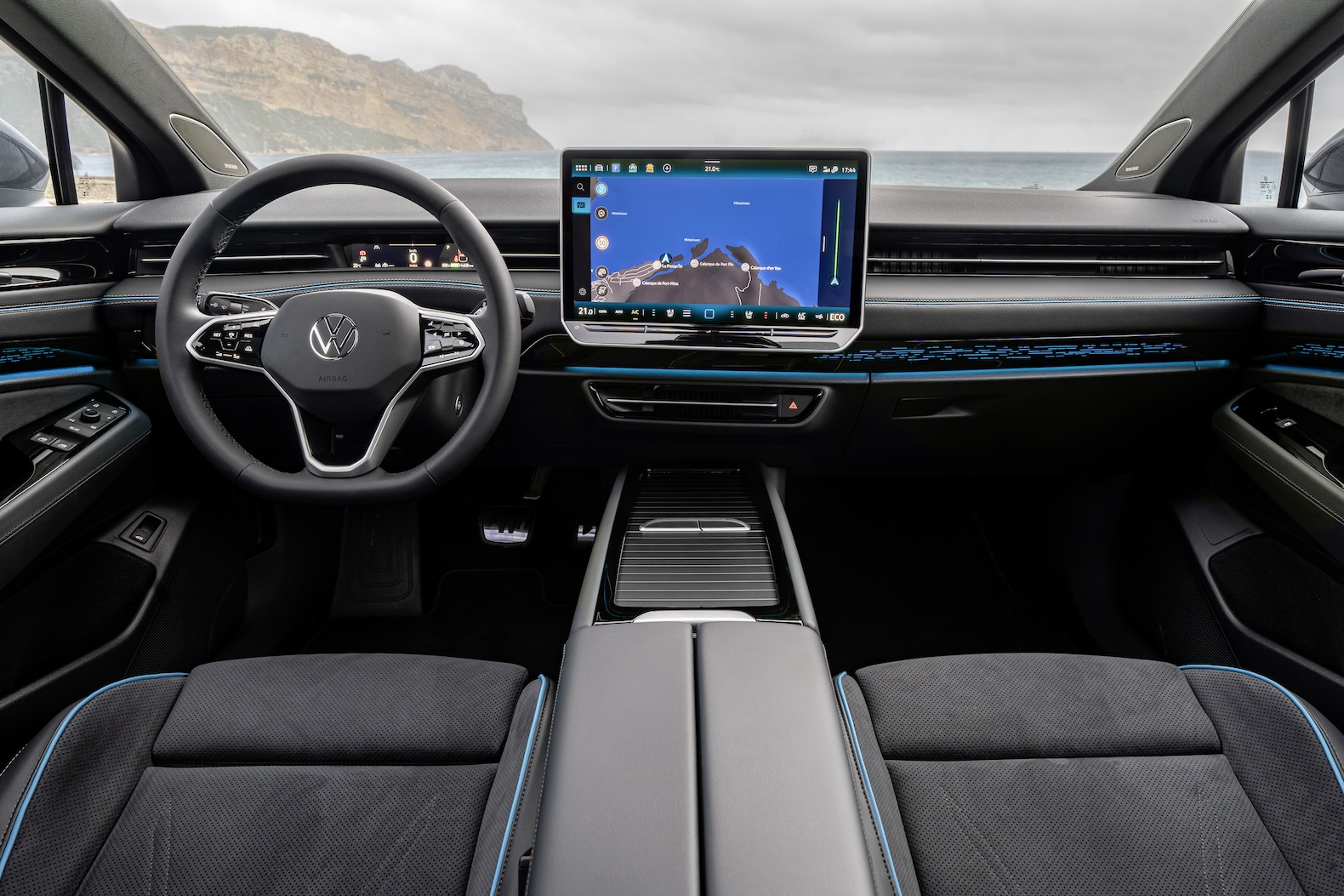 The instrument panel has a strong horizontal orientation and comes with a new 15-inch infotainment touchscreen. The screen has a fresh user interface that’s designed to make the system more intuitive. A head-up display comes standard, displaying navigation, speed, range and other pertinent bits of information.