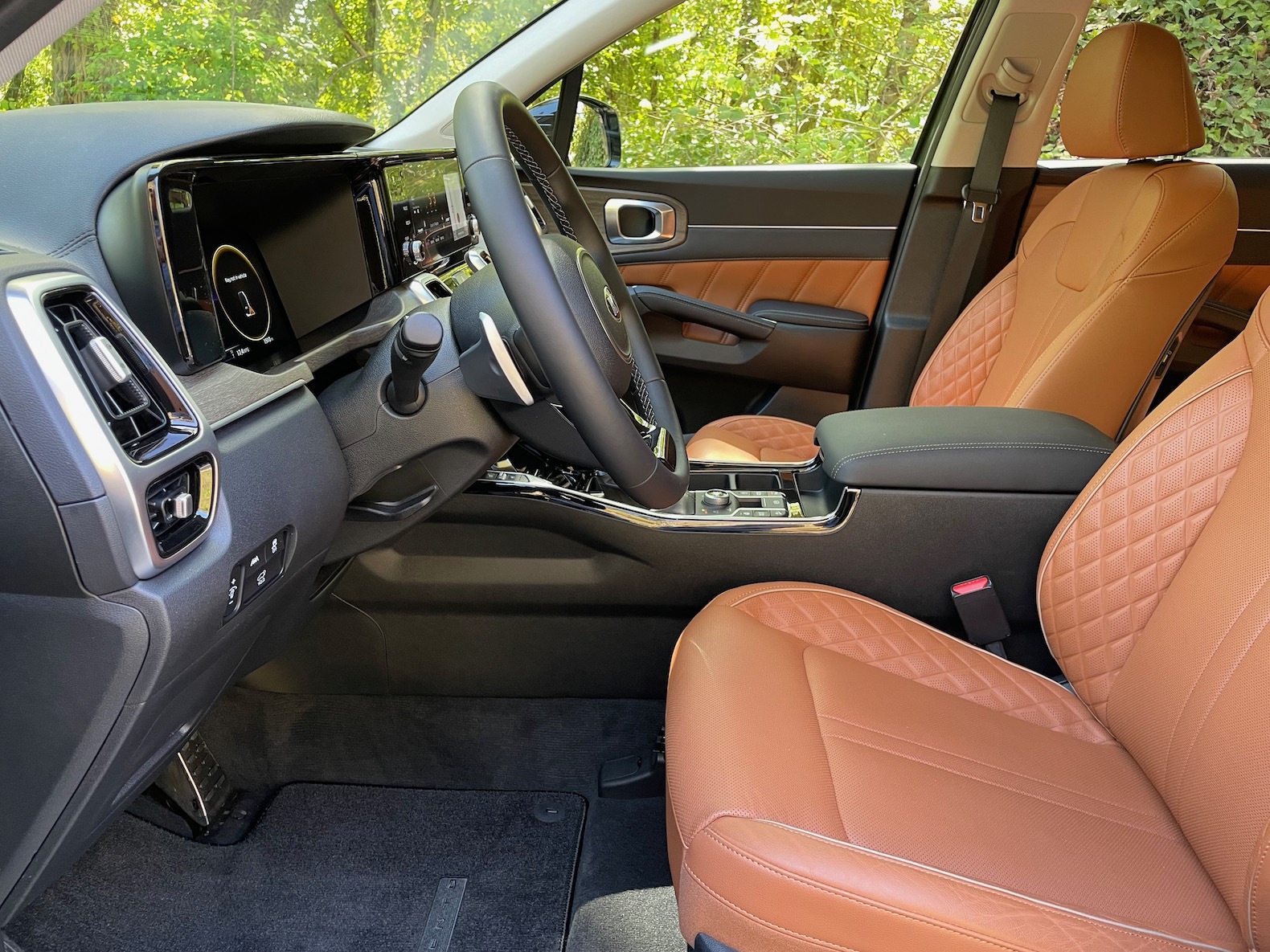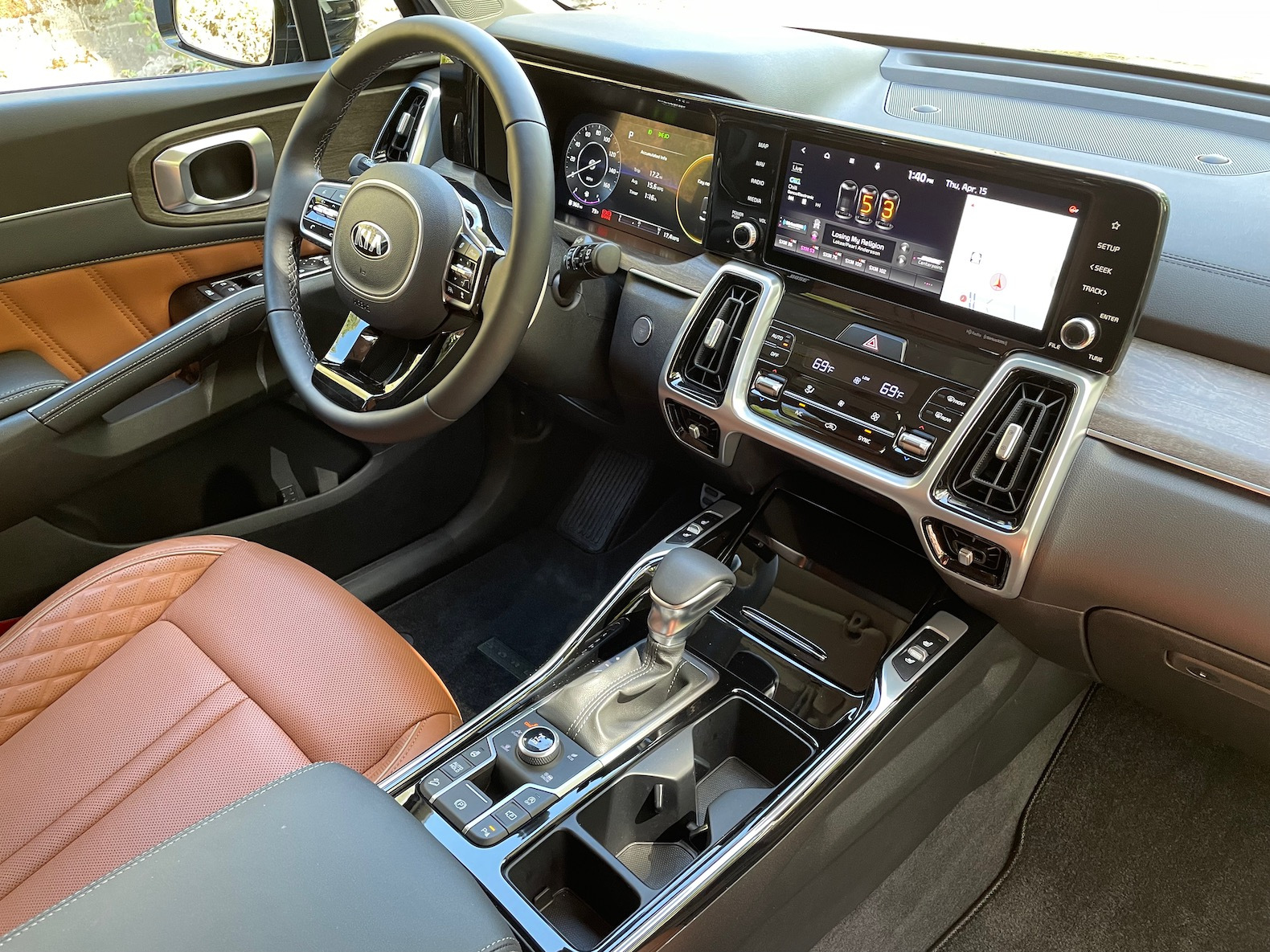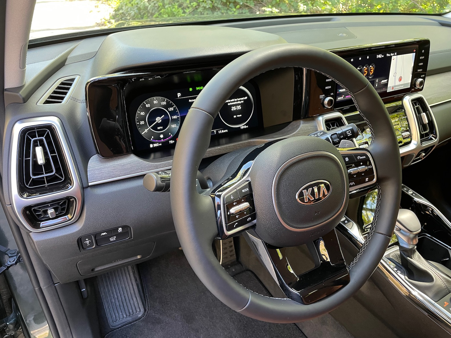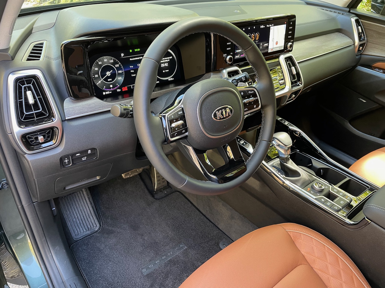 The driving experience is better in some ways, with more lively steering and braking than in the past. A trio of powertrain choices starts with a 191-hp inline-4, turbocharges that engine for 281 hp, or veers off into hybrid territory with a smaller turbo engine strapped with batteries and an electric motor. The coming plug-in hybrid intrigues us and will probably be the best and brightest performer,. All Sorentos have admirable ride quality and steering feel that is better weighted than before.