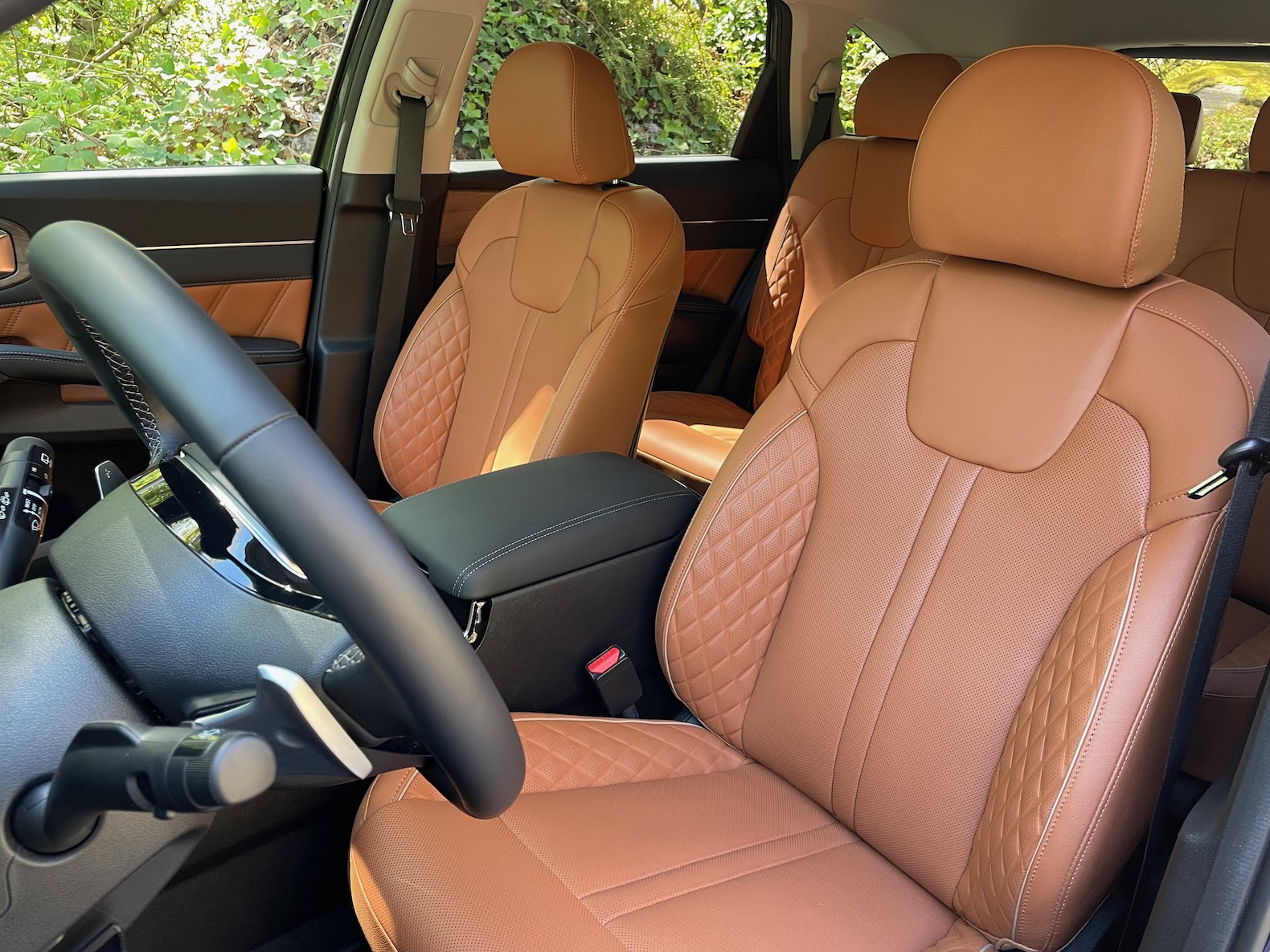 The hybrid checks in with EPA ratings of 39 mpg city, 35 highway, 37 combined. We saw very close to that in lots of high-speed interstate driving. With all-wheel drive, it’s rated at 36/33/35 mpg. Plug-ins score 79 MPGe or 34 mpg combined, and 32 miles of all-electric driving. For the naturally aspirated 4-cylinder, the EPA rates the Sorento at 24/29/26 mpg when it’s configured with the inline-4 and front-wheel drive; 23/25/24 mpg with the same engine and all-wheel drive. With the turbo-4 it’s 22/29/25 mpg with front-wheel drive or 22/27/24 mpg with all-wheel drive.