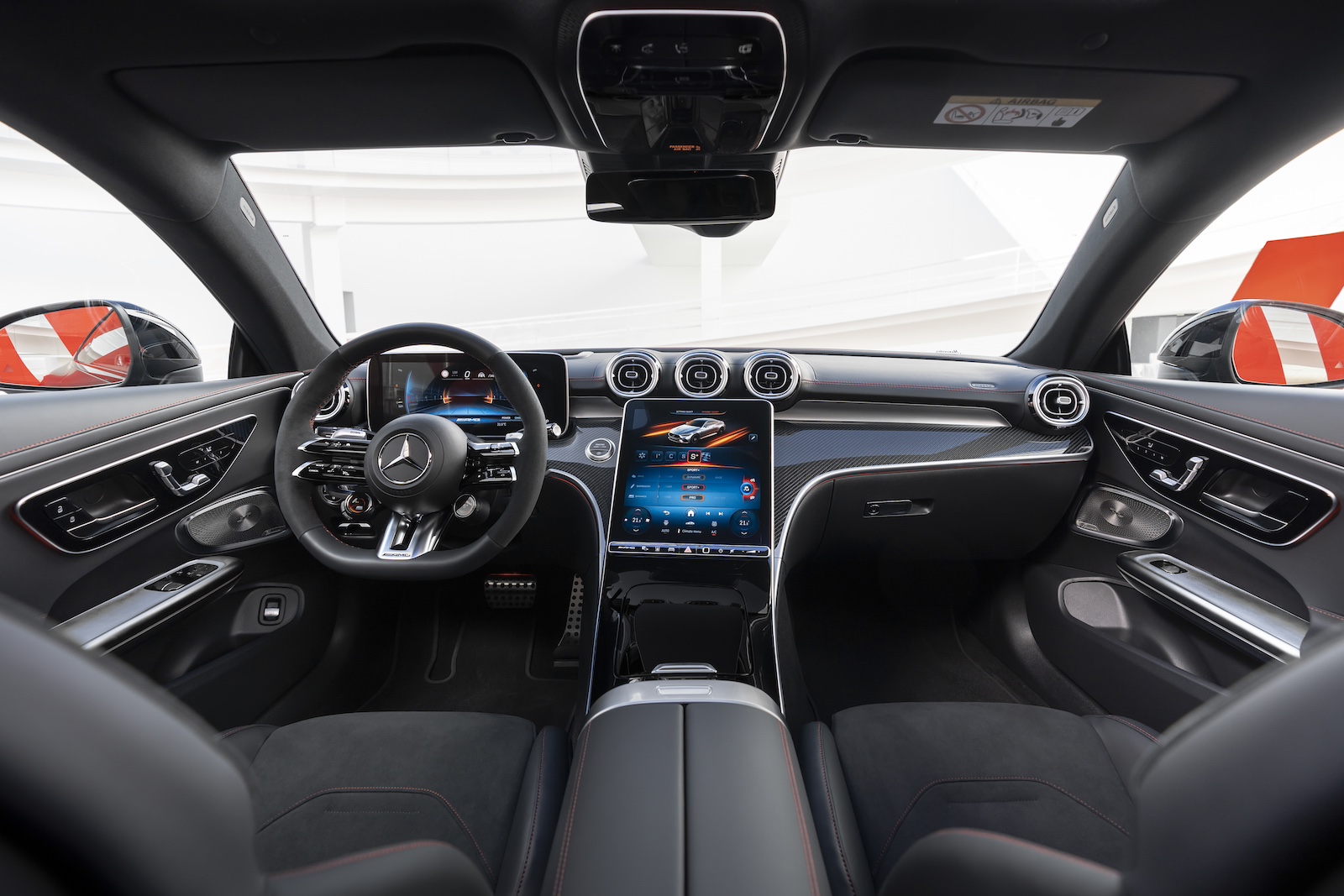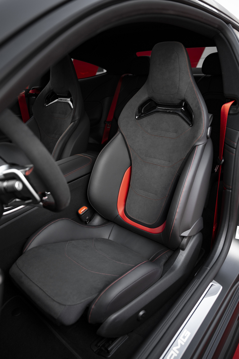 Design upgrades continue inside. Seats are covered in MB-Tex/microfiber upholstery with AMG-specific graphics and red contrast stitching. Nappa leather is optional, as is an AMG Performance Seat Package with more pronounced seat bolsters.