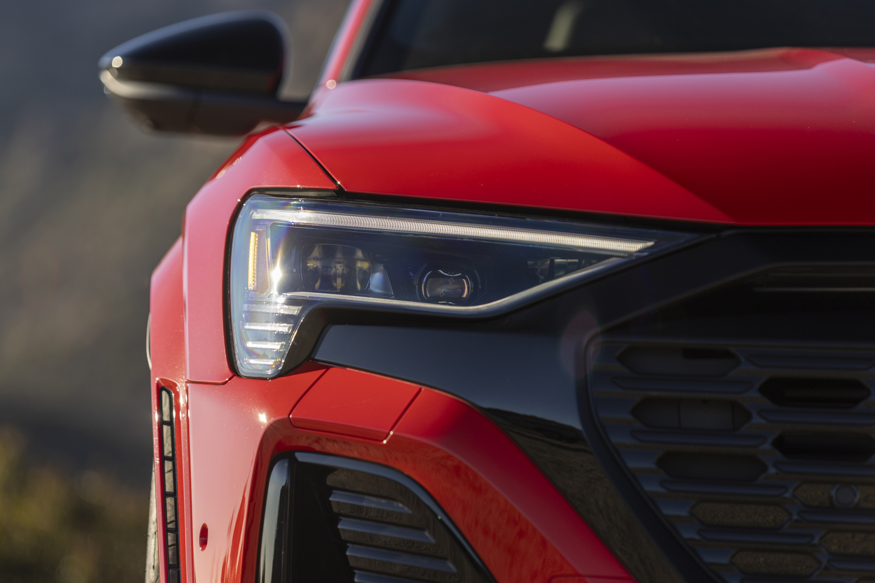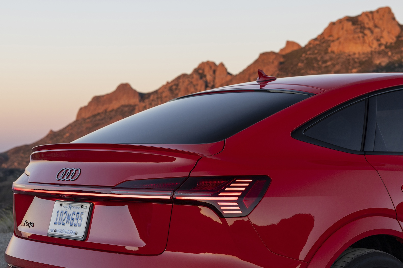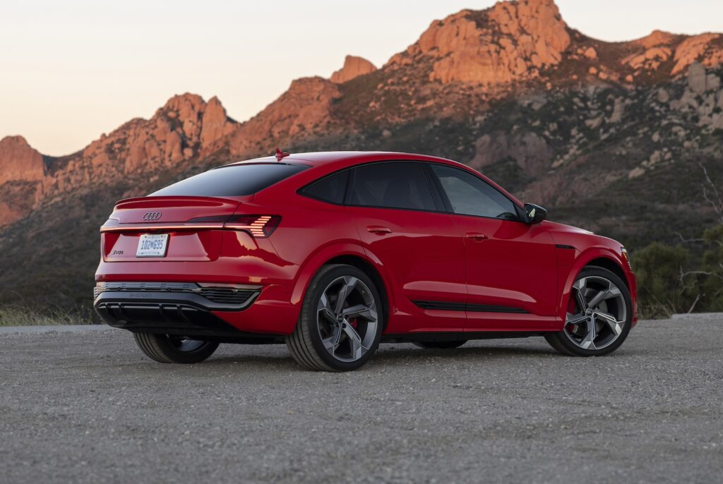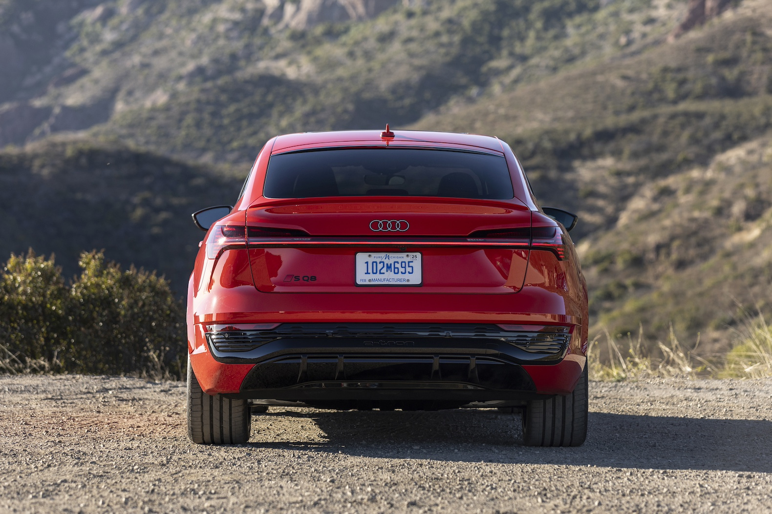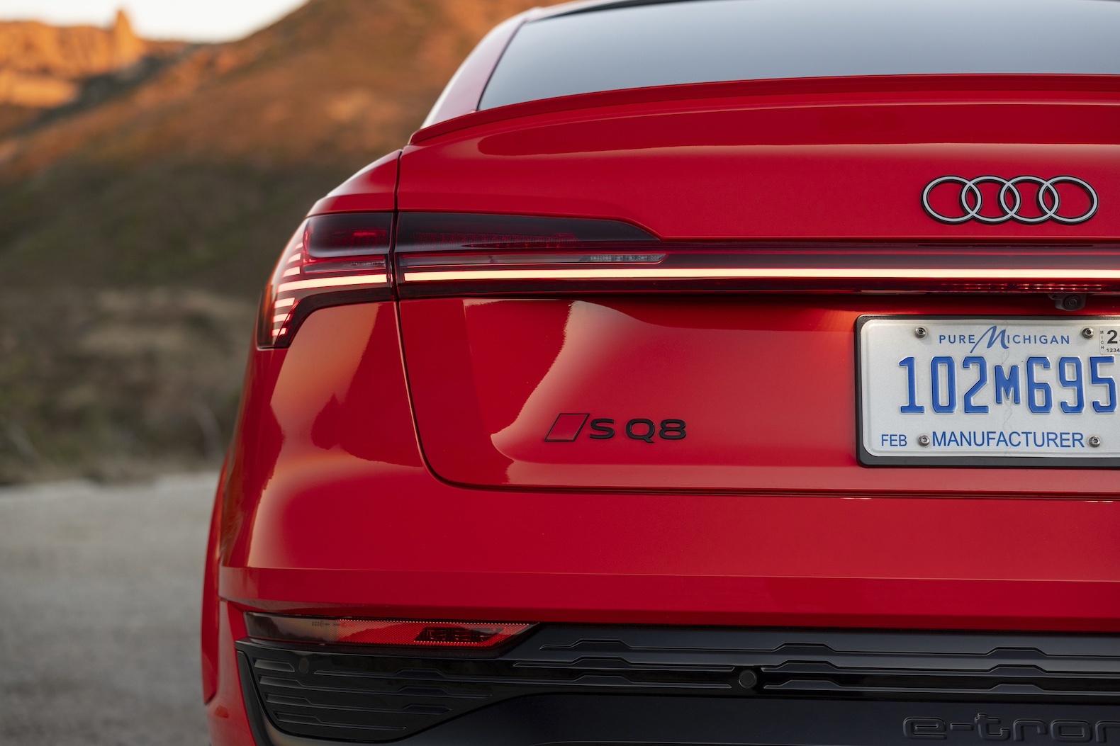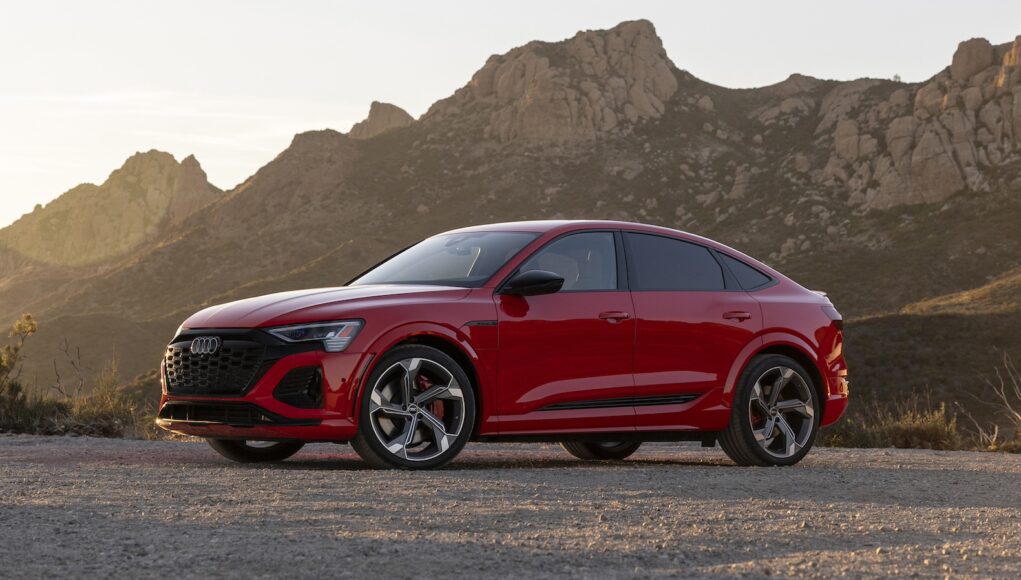 It’s the sportiest rendition of Audi’s largest battery-electric SUV, with one electric motor on the front axle and two on the rear, delivering all-wheel drive. Altogether, the three motors generate 496 horsepower and 718 pound-feet of torque from its 106-kWh battery. Compared to the base Q8 e-tron and its 86.5-kWh battery, there’s an extra 94 horses and 228 pound-feet of torque on tap. That’s enough muscle to bring up 60 mph in 4.2 seconds on the way to a top speed of 130 mph. And it can tow 4,000 pounds with up to a 400-pound tongue weight.