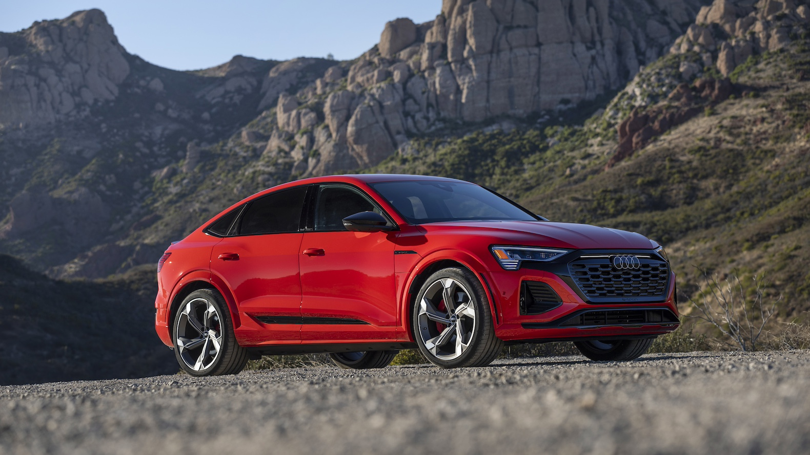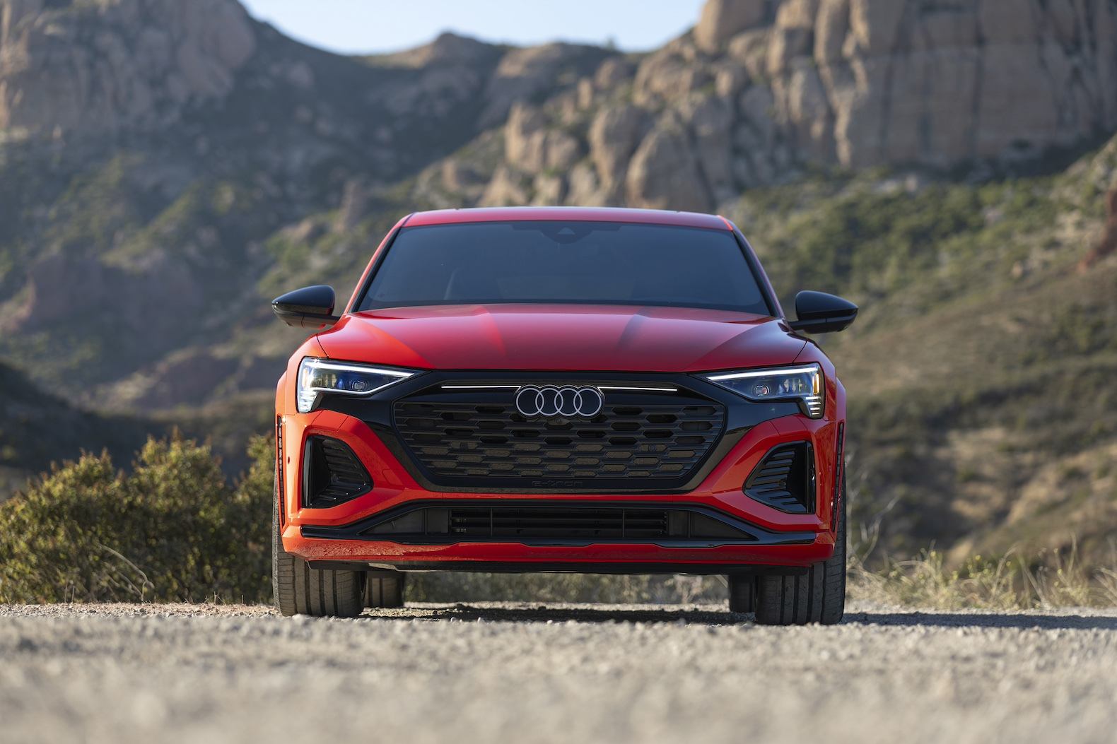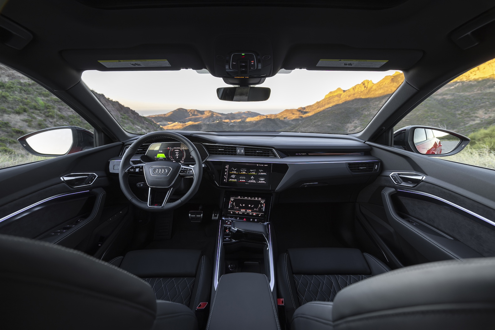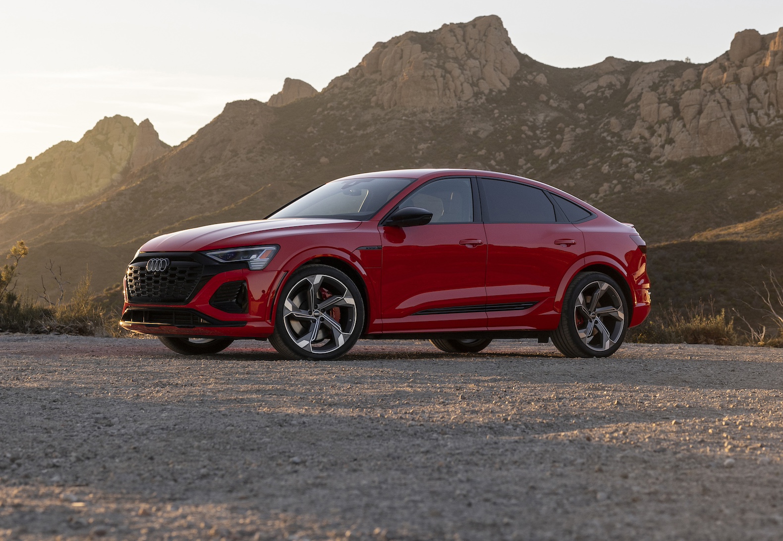 It’s the sportiest rendition of Audi’s largest battery-electric SUV, with one electric motor on the front axle and two on the rear, delivering all-wheel drive. Altogether, the three motors generate 496 horsepower and 718 pound-feet of torque from its 106-kWh battery. Compared to the base Q8 e-tron and its 86.5-kWh battery, there’s an extra 94 horses and 228 pound-feet of torque on tap. That’s enough muscle to bring up 60 mph in 4.2 seconds on the way to a top speed of 130 mph. And it can tow 4,000 pounds with up to a 400-pound tongue weight.