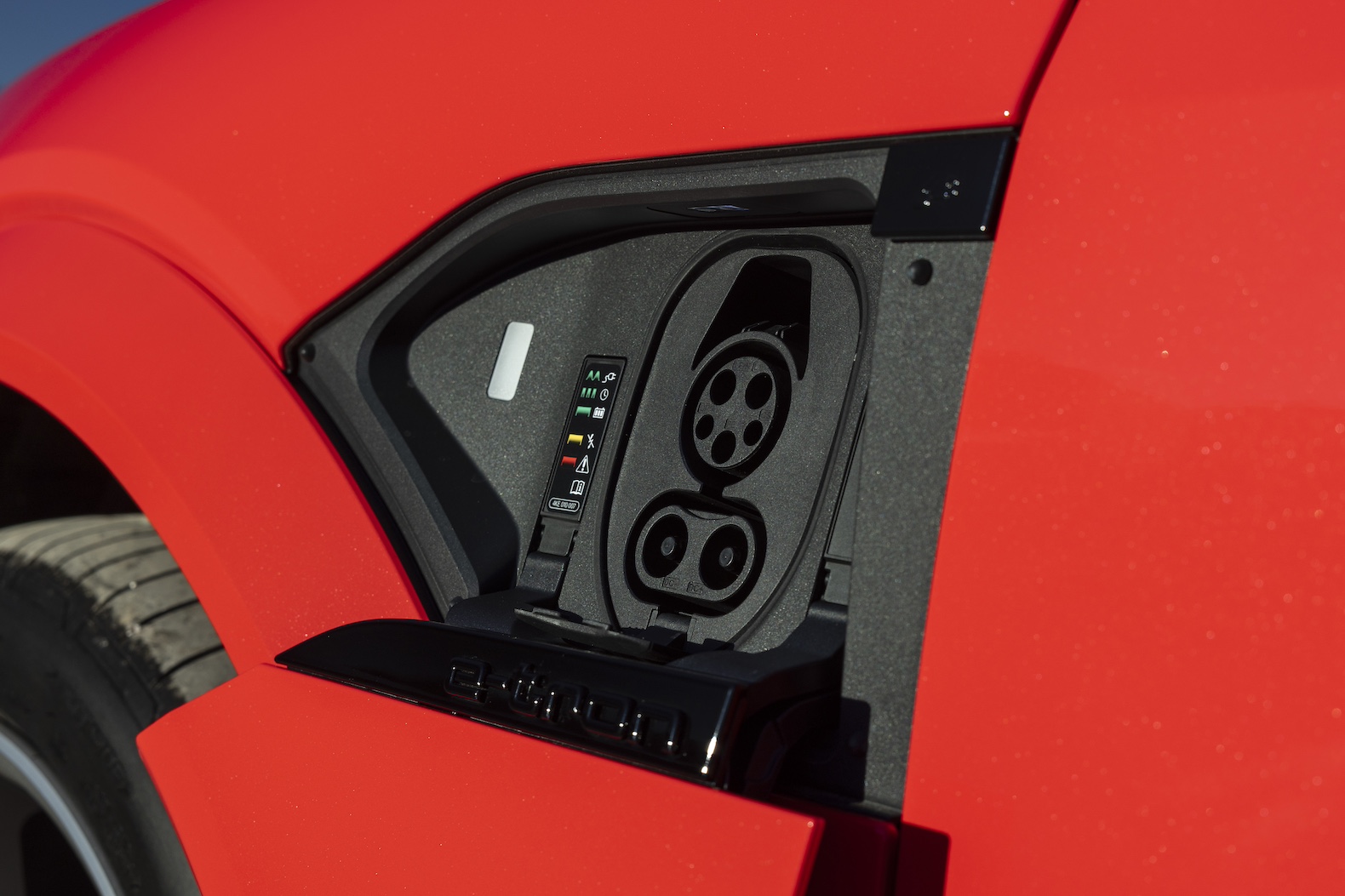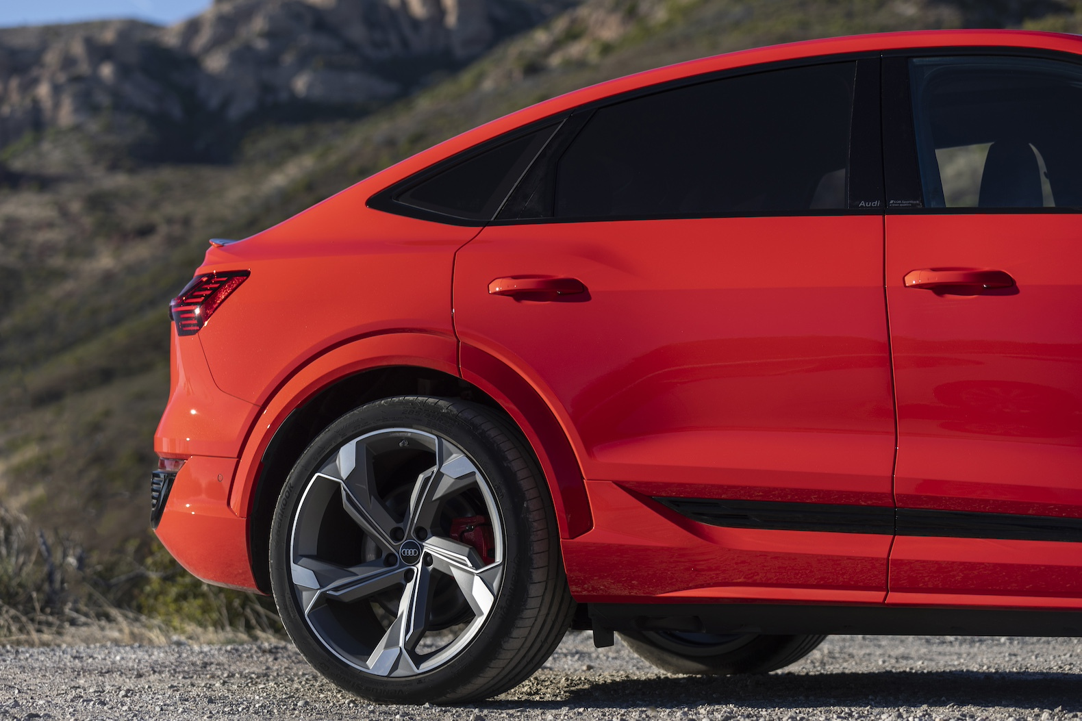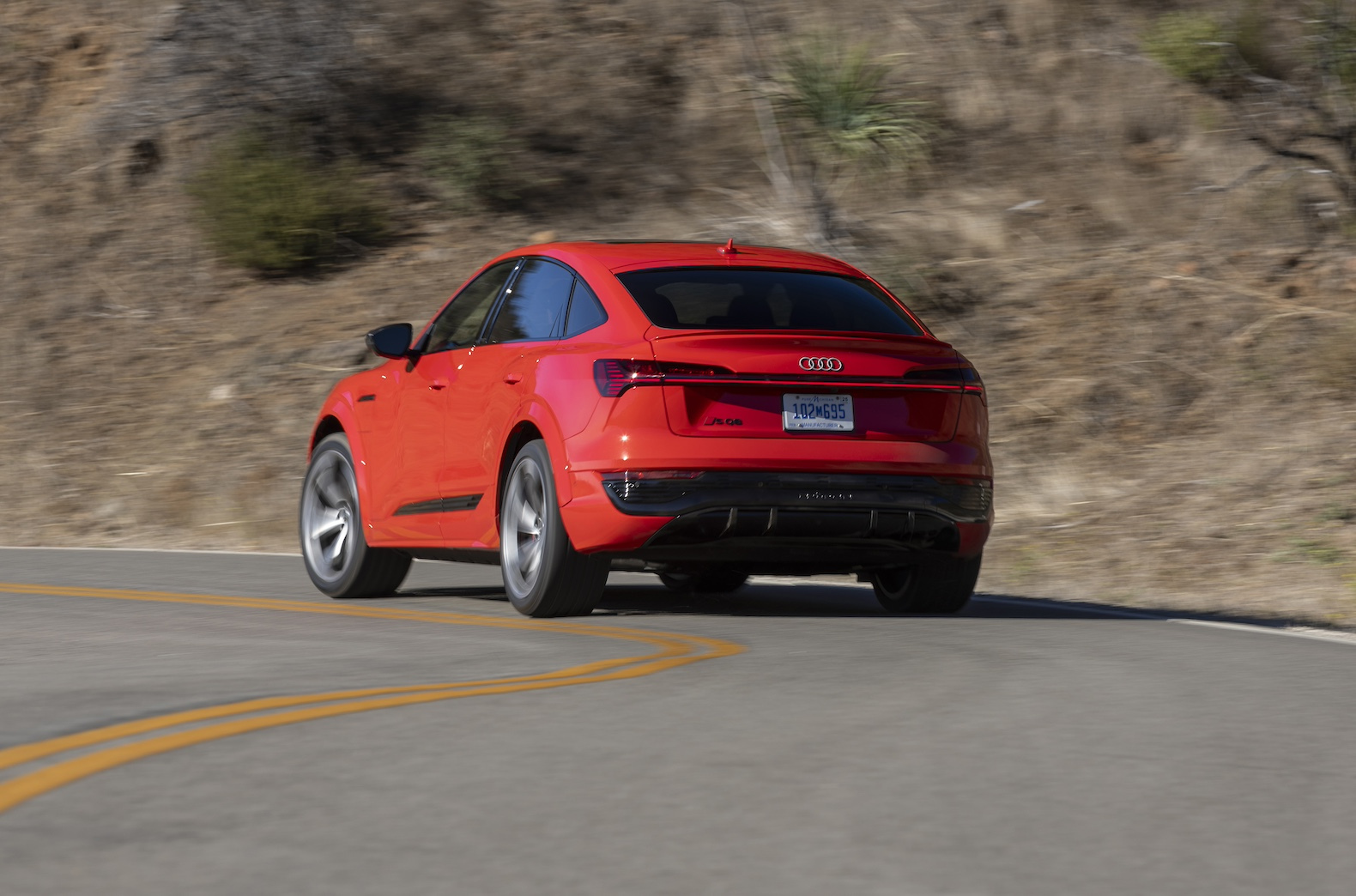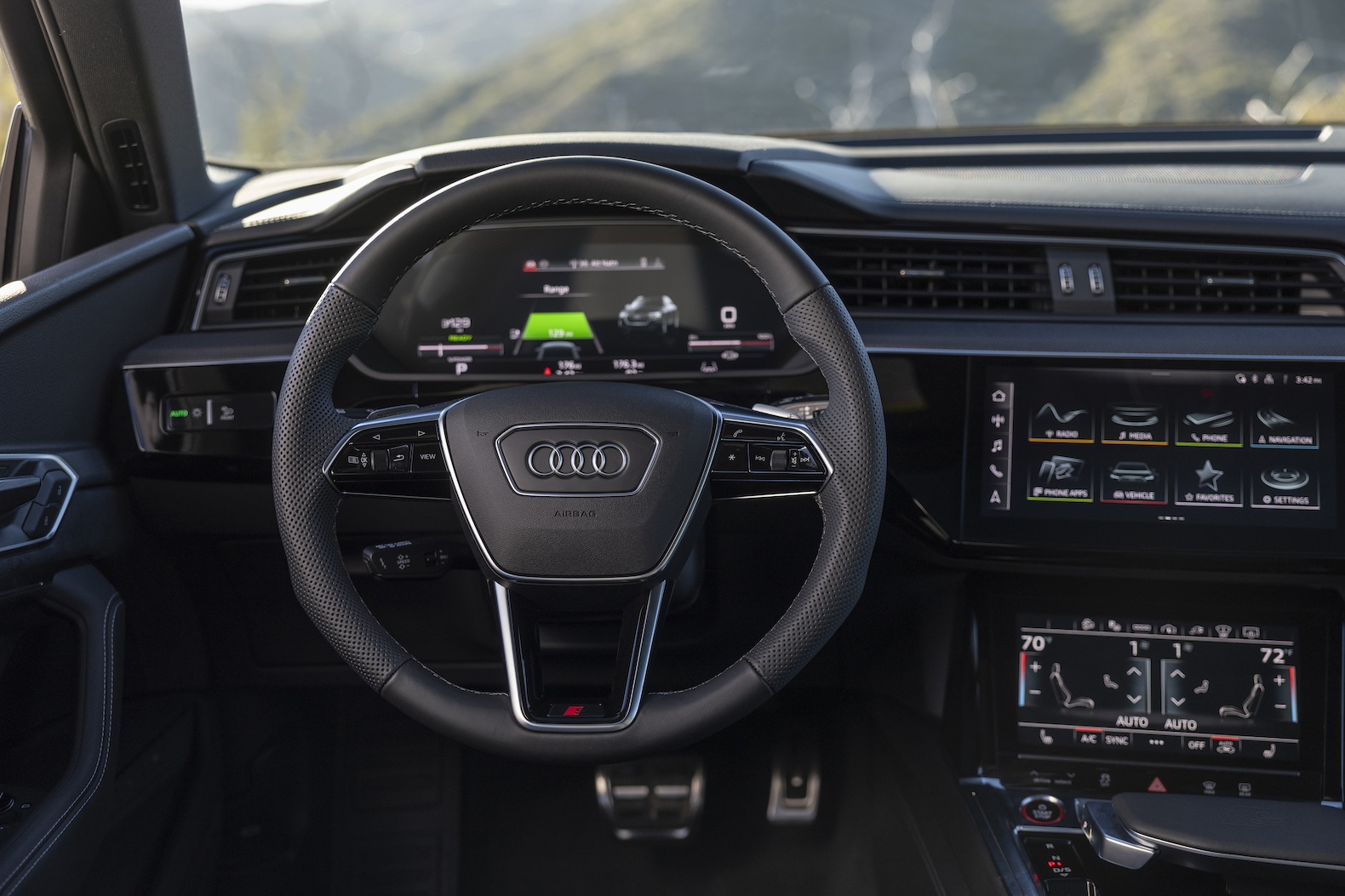 They’re part of the $3,500 Black Optic Package, which shrouds this vehicle’s exterior trim in black. Our vehicle also had the $1,895 AC Charging Package, which adds a second charging port on the passenger’s side of the vehicle. And despite a base price of $98,600, Audi charged an extra $595 for its metallic paint. All told, our fun electric bauble cost $105,740. But fun has its price.