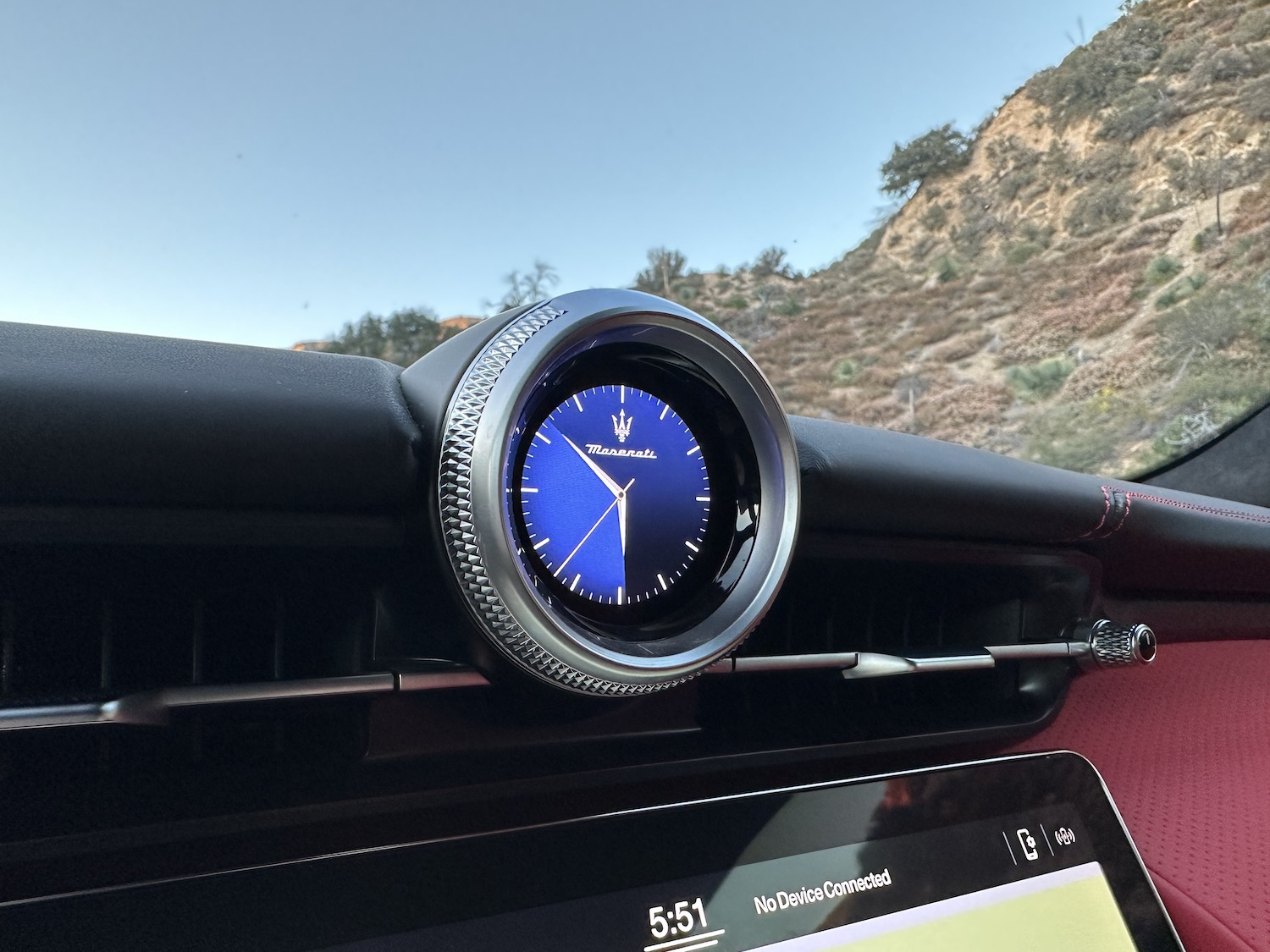 The GranTurismo’s interior is another treat for the eyes, especially finished in my test car’s searing, bordello-spec bright red. Maserati’s done a lot to improve the material quality and fit and finish of its new cars, which is great to see, since older products like the Ghibli and Levante have a decidedly Chrysler-spec vibe. The GranTurismo’s leather-wrapped surfaces feel great and the seats are properly plush. If there’s a single nit to pick here, it’s that the digital clock in the center of the dash looks oddly cheap. This really ought to be analog for the proper luxury effect.