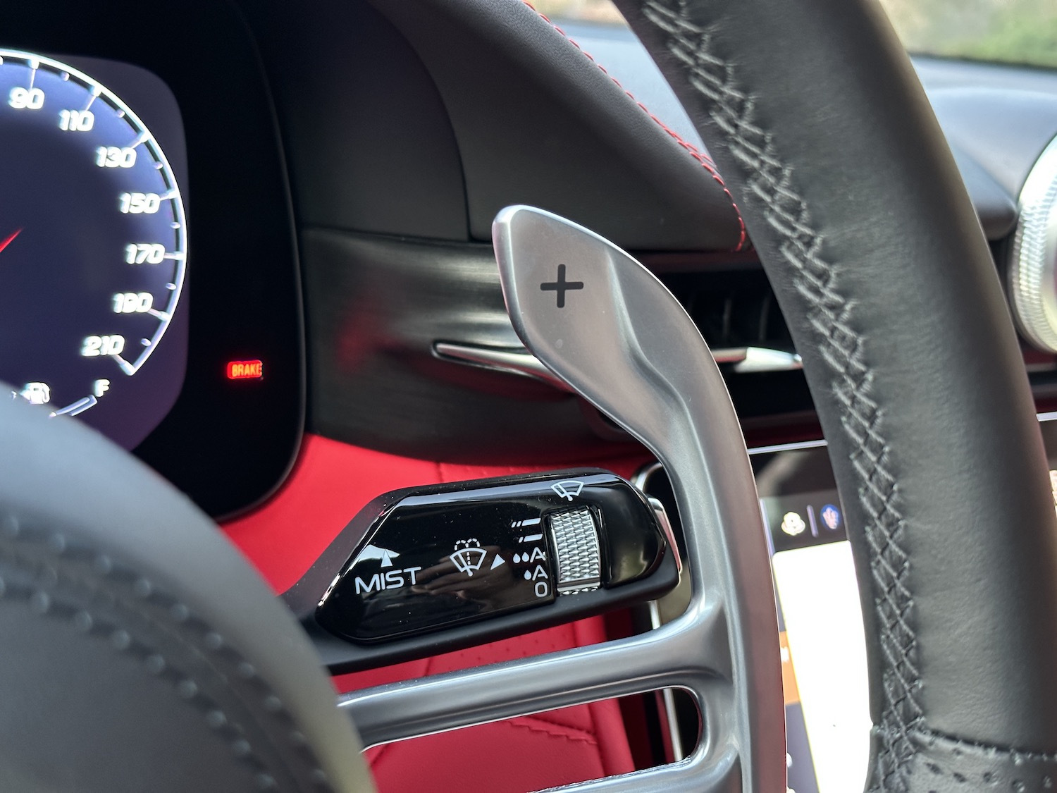 The name GranTurismo certainly reflects this car’s grand touring aspirations, but the Trofeo’s 550-hp Nettuno engine still kicks you in the pants under initial acceleration. It takes 3.5 seconds to launch this car to 60 mph, and the 8-speed transmission slaps through the gears. That brutality isn’t what I’ve come to expect from the ZF8 gearbox, but here it’s a welcome bit of emotion – an intentional bit of excitement that makes flooring the GranTurismo a rewarding thrill. I wish the large, metal paddle shifters were more responsive and indicative of this ferocity, but they’re still fun to use – or, at least, to tap with my fingertips while waiting at a red light.